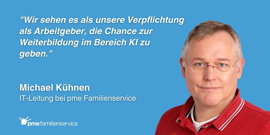 "Wir sehen es als unsere Verpflichtung als Arbeitgeber, die Chance zur Weiterbildung im Bereich KI zu geben. Deshalb haben wir uns bewusst dafür entschieden, unsere KI-Plattform Nova für jeden im Unternehmen zugänglich zu machen." – Michael Kühnen, Leiter IT bei pme Familienservice