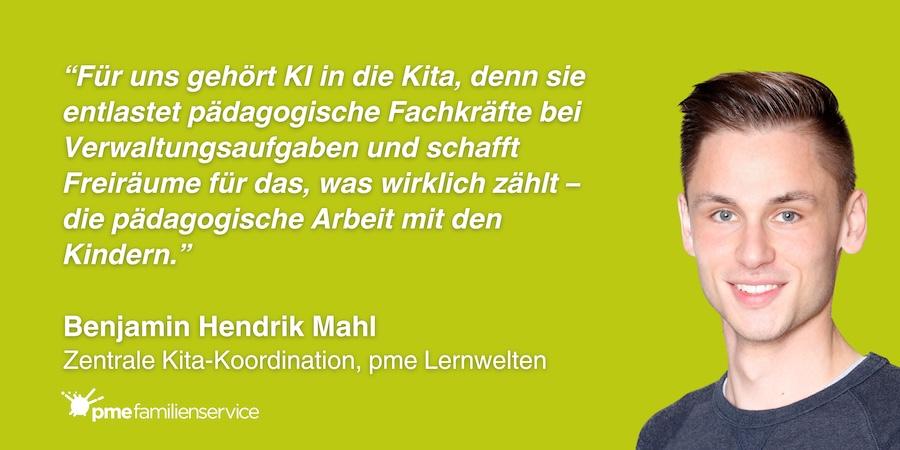 "Wir sehen KI nicht als Selbstzweck, sondern als Werkzeug, das Kindern und Fachkräften dienen muss. Gemeinsam mit unseren Teams erproben wir, wo KI echten Mehrwert bietet, und wo es auch Grenzen gibt. Datenschutz und pädagogische Verantwortung stehen dabei immer an erster Stelle." – Benjamin Hendrik Mahl, zentrale Kita-Koordination, pme Familienservice