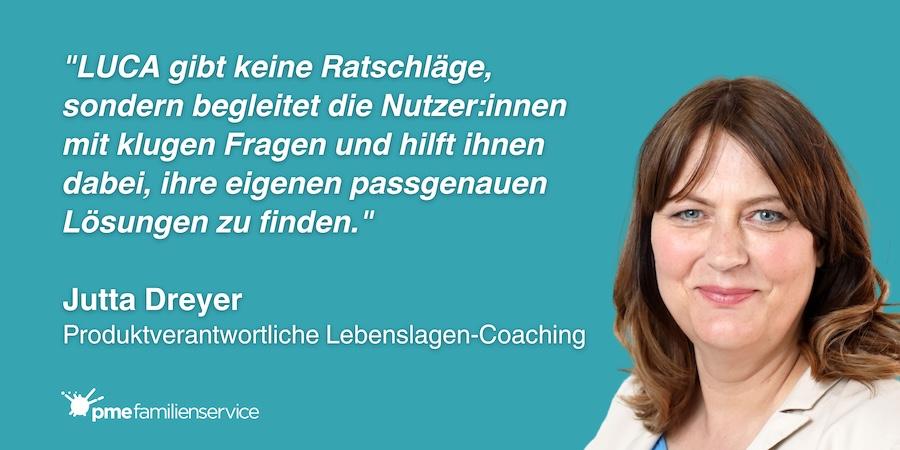 "Viele Menschen wollen oder können in bestimmten Situationen nicht mit einer Berater:in sprechen, manche möchten zunächst allein oder anonym bleiben. Mit LUCA haben wir für sie die passende Lösung." – Jutta Dreyer, Produktverantwortliche Lebenslagen-Coaching
